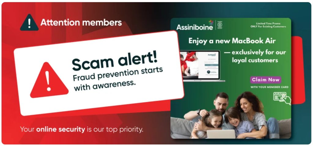 Nous sommes au courant d’une publicité frauduleuse qui circule actuellement en anglais sur les médias sociaux et qui prétend à tort que Caisse Assiniboine offre un MacBook Air « exclusivement à nos précieux membres ». Cette publicité n’a pas été créée ni autorisée par nous.